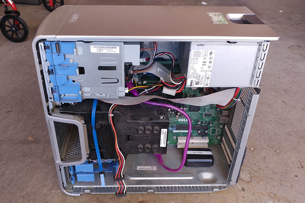 A computer tower with a tracking device provided by the Green Tracking Service (device at lower right).