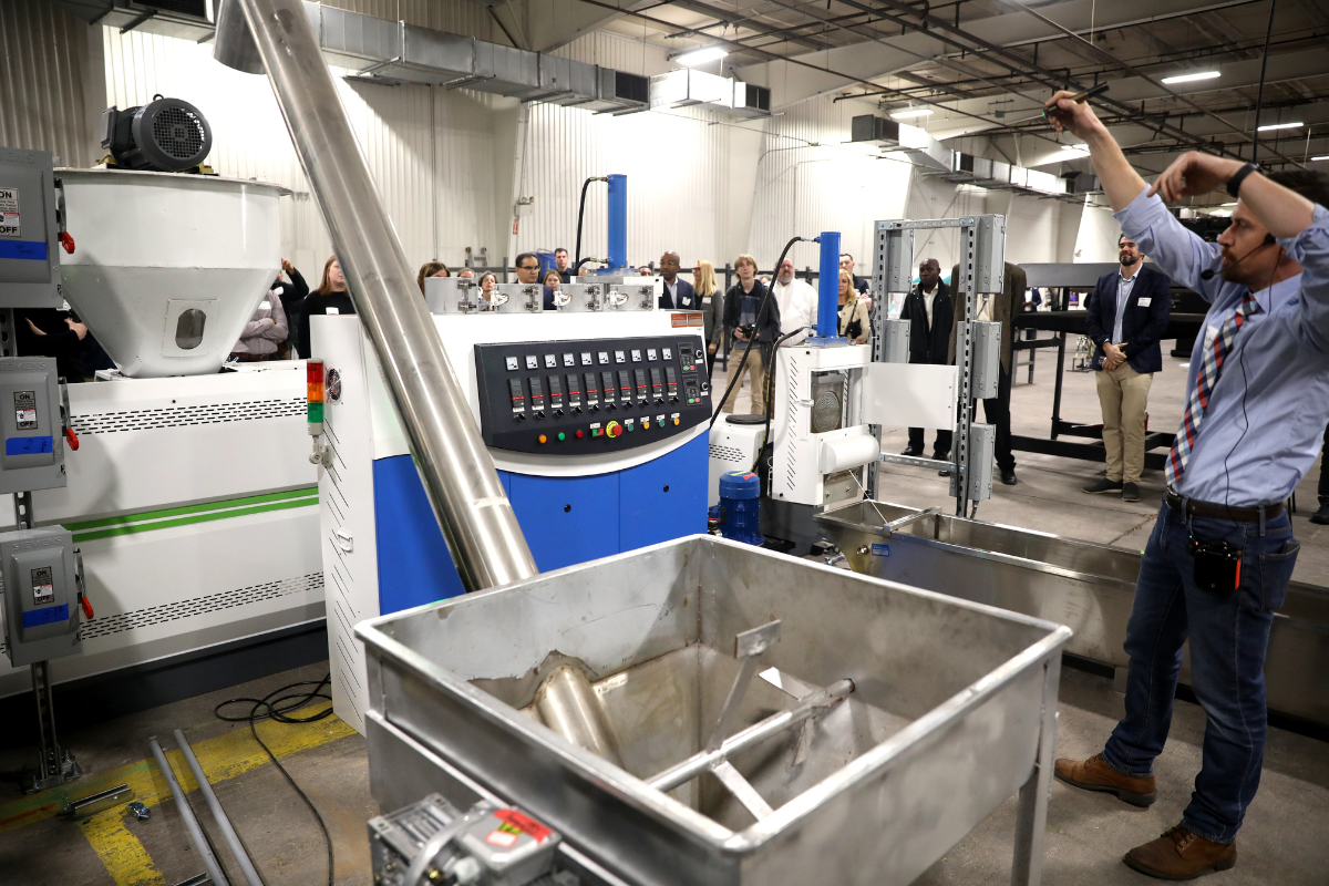 Equipment in the facility includes a wet wash system, drying drum, an extruder, a pelletizer, a sheet press and a molding machine. The team is not sharing the cost of the project.