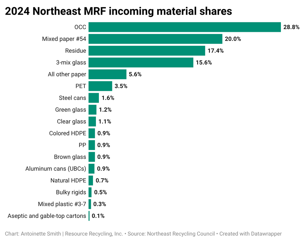 The report also showed the 2024 share of each material at 18 MRFs, with OCC and mixed paper representing nearly one half of incoming volumes. Of the included states, five have deposit return systems for beverage containers, which results in fewer glass bottles, PET bottles and aluminum cans winding up in MRFs there. In addition, MRFs in those states typically generate less revenue from those recyclables, the report said.