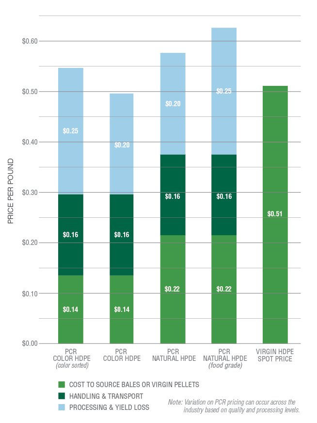 Developing PCR that can compete with virgin resin, in terms of performance or consistency in specifications, requires significant cost in handling and processing. The breakdown of those recycling costs for two common types of recycled plastic – color and natural HDPE – are shown in the bar graph. The numbers are based on interviews with various plastic reclaimers.