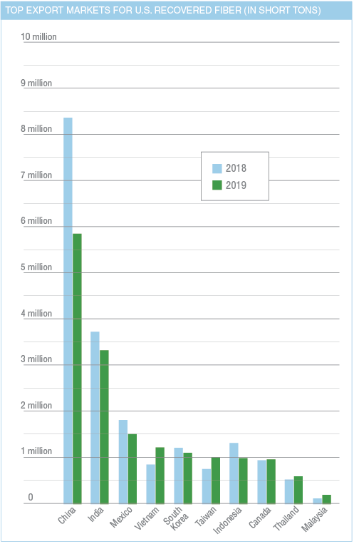 The graph below shows the 10 largest export markets, in terms of tonnage, for U.S. recovered paper in 2019. It also indicates how those countries changed their intake from 2018 to 2019.