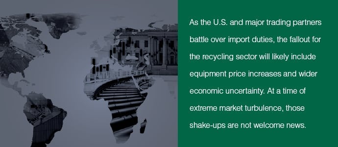Here, we’ll outline the ways this global economic issue is already shifting recycling realities, and we’ll analyze some of the longer-term impacts and unknowns a sustained international trade war could bring to materials recovery stakeholders.
