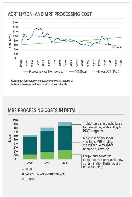 MRFs’ fixed costs have more than doubled from 2009 to 2018. This is due to MRFs investing in new technology to stay competitive, adapt to a changing materials stream and meet increasingly stringent bale-quality standards.