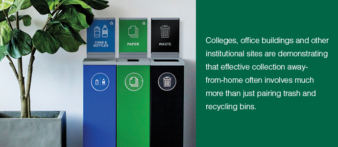 To truly advance materials recovery, institutions need to rethink their collection programs from the ground up. Recognizing this, a growing number of organizations are embracing steps such as redesigning waste bins, using strategic bin placement patterns, adapting the role of custodians and even shifting more responsibility for handling waste to individuals.