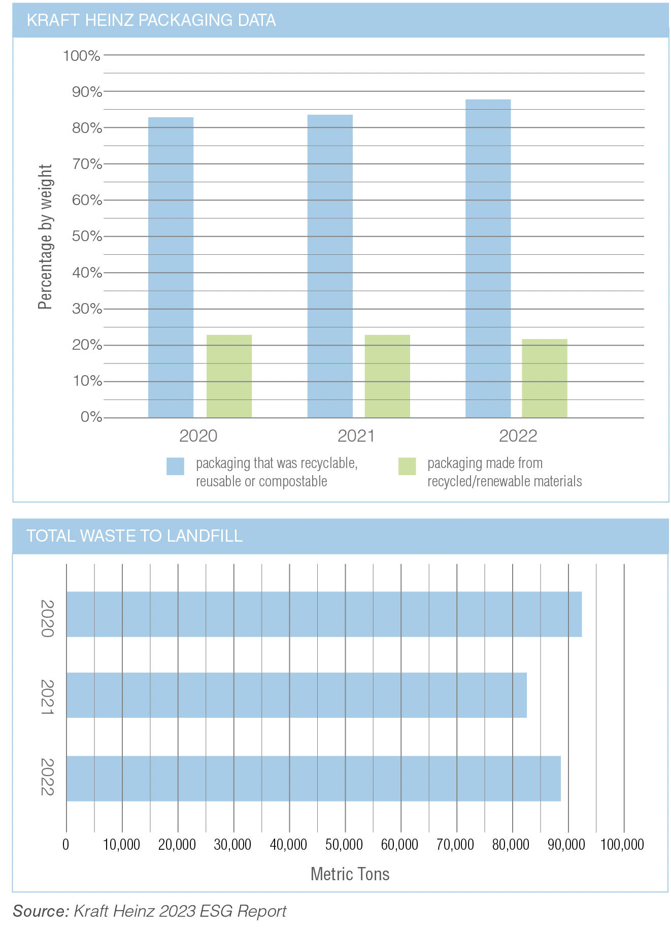 The company also reported using 1.2 million metric tons of packaging in 2022. Of the total amount of packaging, 21% (by weight) was made from recycled and/or renewable materials, down one percentage point from 2021. In terms of total waste to landfill, Kraft Heinz reported waffling numbers for the past few years, with 2021’s total weight (in metric tons) dipping to 82,617 from 92,856 in 2020 but then jumping back up to 89,296 in 2022.